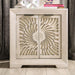 This night stand is a definite showstopper. An etched wooden sunburst pattern serves as the focus, grabbing everyone's attention. What keeps the flamboyant centerpiece in check is the rather subdued ivory color, hand-painted and hand-finished to bring out the beauty of the solid Brazilian pine wood. The result is a night stand that's nothing short of exotic.